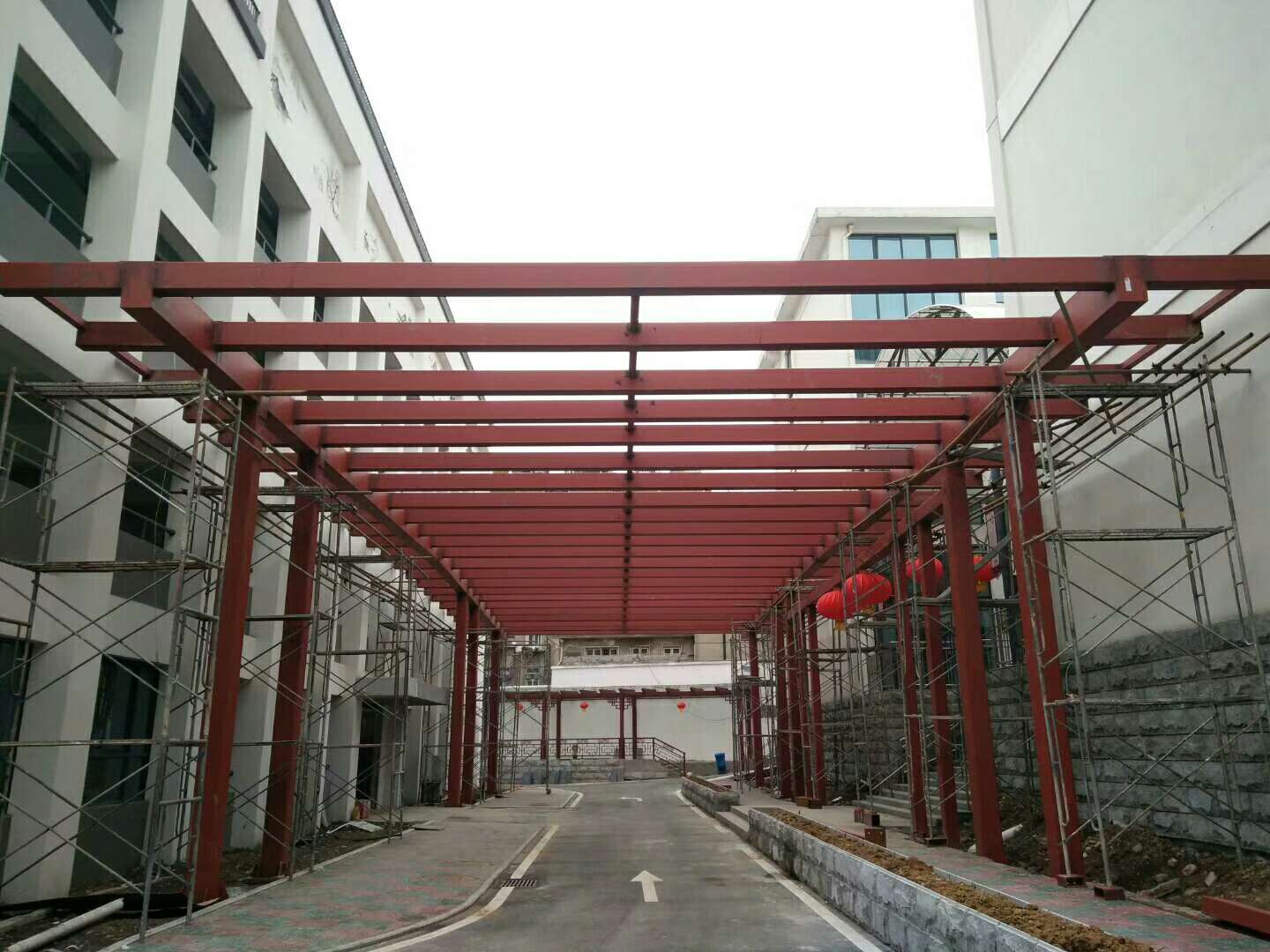 現階段施工總面積為 1205 平方米 ,其中建筑包含 長廊、九宮花格護欄、車庫廊架;仿木紋漆顏色由安徽省副省長李建中同志親自挑選,由莫藝師傅反復調色,現場多次試樣才得以最終確定。