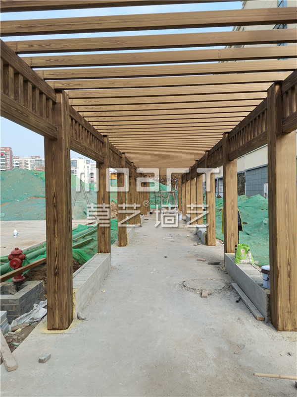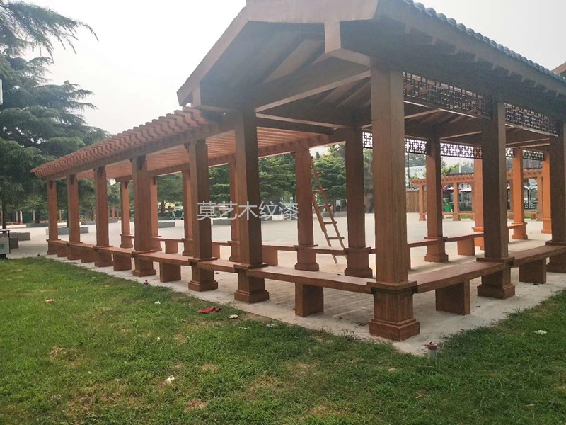 水泥異形廊架木紋漆,紋路選擇年輪紋比較好看,年輪紋紋路貼近自然,符合自然蘊(yùn)美,而且即使人站在遠(yuǎn)處也能從視覺(jué)上觀賞到一圈一圈樹(shù)木象征的年輪紋。水泥廊架一般客戶選擇最多的還是紅色系,紅色系的木紋效果更像古木,效果更逼真。