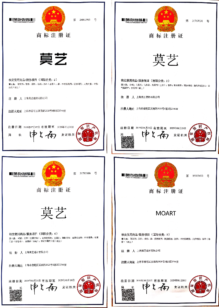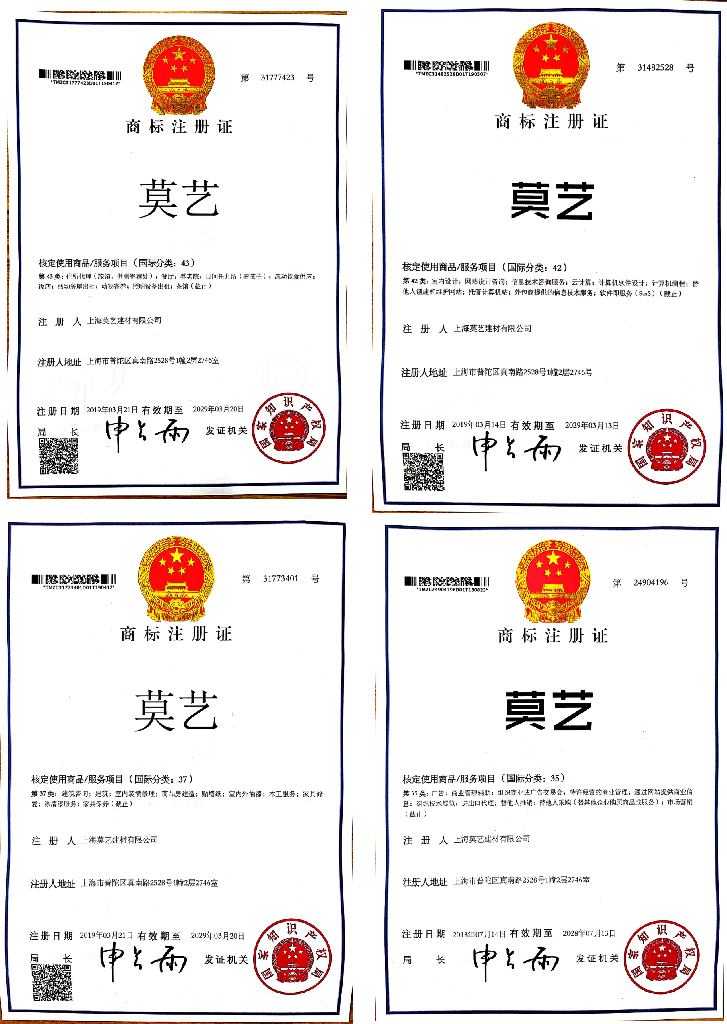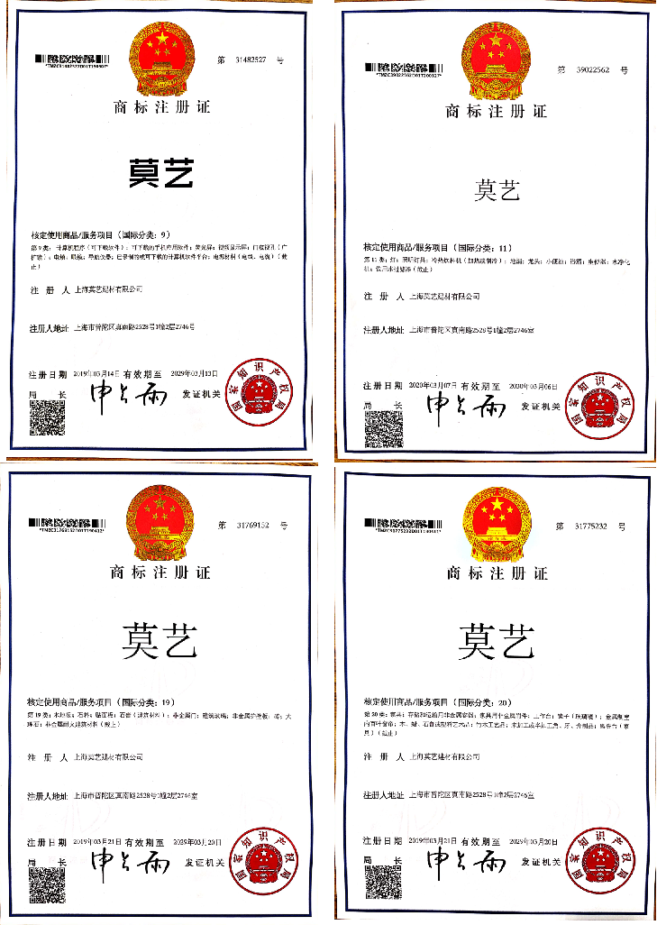 近年來莫藝集團發展持續增長,經營業務日益擴大,客戶口碑不斷提高。公司為了實現品牌戰略規劃及適應市場日新月異的變化,進一步提升品牌效應,在已有類別的商標注冊證基礎上,申請其他類別的商標注冊并成功通過申報,至此莫藝集團完成了“莫藝(或MOART)”商標的全類別注冊,共45個大類。